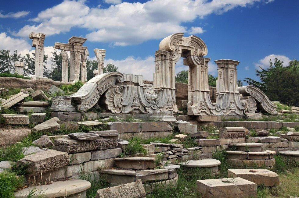 The ruins of the Yuanming Yuan Palace (summer palace) in Beijing. The palace was destroyed in 1860 by the British. It was built in a distinctly European style. It is difficult to imagine anything European but unrelated to the colonial activities of the British existed in China and Southeast Asia.