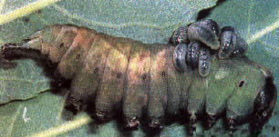 "Наконец, личинка пилильщика отвлекается от питания и выполняет свойственную ей оборонительную реакцию: грозно приподнимает и изгибает задний конец тела"