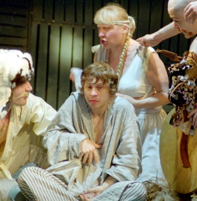 «Вий» в Театре Пушкина Дверь в НЕБЫТИЕ Сложные вопросы В режиссёрском сценарии и в спектакле отсутствует первая встреча Хомы и ведьмы, нет о ней и никаких упоминаний. Спектакль начинается сразу же без всякого пролога и предыстории. Сотник и его холопы поминают умершую Панночку, прибывает Хома. Почему именно Хому Брута вызвала из киевской бурсы умершая Панночка читать по себе самой молитвы? Почему, проснувшись однажды утром Грегор Замза, обнаружил, что он превратился в страшное насекомое? Почему для каждого человека существует день, в который прекратится его жизнь? Почему каждый человек умирает в какой-то конкретный день, ничем не примечательный для всех остальных? Почему умирающие не плачут? Почему человек не может представить себе свою собственную смерть? … Думаю, что на эти вопросы нет ответа. Но не пытаться отвечать на них – невозможно. Спектакль Чусовой – это бесстрашная и мистическая попытка найти ответ на вопросы, на которые невозможно ответить. Комиксы Поначалу спектакль представляется этаким цветным комиксом – яркие картинки из «народной» жизни следуют одна за другой: травка зеленеет, мухи летают, бульканье крепкой горилки, хруст зелёных огурчиков, козак в алых шароварах и папахе и дивчина с цветными монистами, словно пришедшие из мультика, представляют так, как они это ЗНАЮТ, историю ведьмаки и простого парня, псаря Микитки. Потом будет ещё один «народный комикс» - вий (меховой шар с огромными неподъёмными веками) и прочая нечисть. В этих «комиксах» режиссёр отобразила стереотипы народного сознания, именно так «народ» представляет НЕВЕДОМОЕ, ПОТУСТОРОННЕЕ. ![]() Человек и ОНА На самом деле в жизни, а не в «народных» комиксах, (в той жизни, что создал театр) - всё по-другому – чудовищ в потусторонне мире нет, там есть лишь НЕБЫТИЕ и ОНА, появившаяся ОТТУДА и ТУДА его, живого человека, уводящая. ОНА – это смерть, НЕБЫТИЕ – это … Автор, Н.Г., Н.Ч.! Дай ответ! … Нет ответа!. Косноязычный философ Хома Брут – замечательный образ маленького человечка, продолжающий галерею маленьких людей артиста П.Деревянко, начатую Башмачкиным, только Акакий Акакиевич пытался разобраться в своих отношениях с миром, с жизнью, а у Хомы задача посложнее – ему предстоит встреча с НЕВЕДОМЫМ, с НЕПОЗНАВАЕМЫМ – со смертью. Вначале он, как и любой смертный, который не ждал встречи с НЕЙ, ничего не понял – он бодро покрикивает: «Ну, где ты мертвяк?», монотонно бубнит Псалтырь. До тех пор, пока ОНА не примет его в свои крепкие смертельные объятия. «Ой, как там холодно!» Он возвращается после очередной встречи, словно выныривает из глубины, в выключенный и заторможенный мир – нет, это он уже наполовину ТАМ, каждое его погружение ТУДА происходит всё глубже и глубже. И, наконец, он исчезает в той двери, пройти через которую суждено каждому человеку. Смерть В спектакле ОНА совсем не страшная, в ней бездна … ледяного, холодного обаяния. ОНА – представительница иного, непонятного нам мира. ОНА – нечто неизбежное, необходимое, некий деструктивный континуум, одолеть ЕЁ человеку не по силам. ![]() Два месяца назад режиссурой театра Пушкина была совершена очевидная ошибка – актриса ледяного темперамента В.Исакова была назначена играть героиню темперамента огненного – Ларису в «Бесприданнице», результат – провал, причём провал прежде всего режиссёрский. Сегодня ошибк