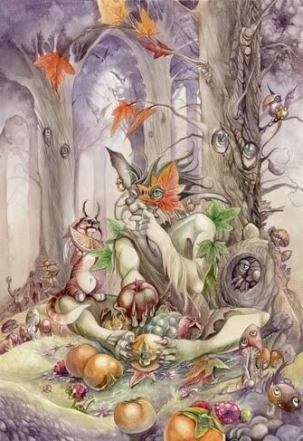 Осенняя ярмарка Morning and evening Maids heard the goblins cry: "Come buy our orchard fruits, Come buy, come buy: Applies and quinces Lemons and oranges, Plump unpecked cherries, Melons and raspberries, Bloom-down-cheeked peaches, Swart-headed mulberries, Crab-apples,dewberries Pine-apples, blackberries, Apricots, strawberries;-- All ripe together In summer weather,-- Morns that pass by, Fair eves that fly; Come buy, come buy: Our grapes fresh from the vine, Pomegranates full and fine, Daces and sharp bullaces, Rare pears and greengages, Damsons and bilberries, Taste them and try: Currants and gooseberries, Bright-fire-like barberries, Figs to fill your mouth, Citrons from the South, Sweet to tongue and sound to eye; Come buy, come buy." --from "Goblin Market" by Christina Rossetti-- Просматривая журнал Нашла там много нового (а может быть пропущенного раньше). Крылатые кошки, лисы-обортни, эльфы и феи: http://www.shadowscapes.com/gal_CREATURE