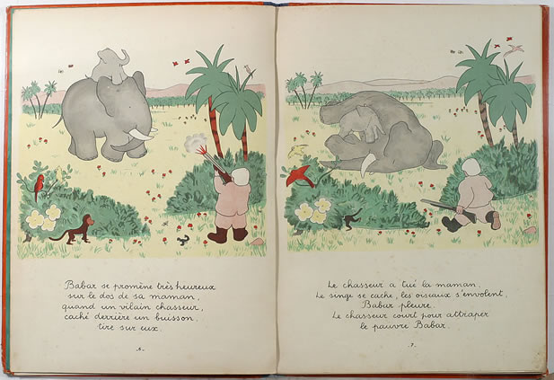 Однажды счастливый Бабар отправился погулять, сидя на спине у своей мамы. Вдруг раздался выстрел. Гадкий охотник спрятавшийся в кустах, убил маму. Бабар так испугался, что бросился бежать, и вот он бежит, бежит не останавливаясь..."
