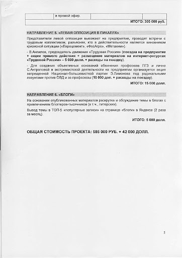 Взялись за Дерипаску и вывалили методы борьбы с конкурентами и рабочими. "...Журнал международного разведсообщества Intelligence On Line обнаружил, что в сети выложена новая порция переписки Отдела Дезинформации, работающего на Олега Владимировича Дерипаску, который в этих письмах именуется ОВД. В недавние задачи группы (как следует из только опубликованного, а сколько еще объектов – неизвестно) входит «мочение»: Потанина, Усманова, Ивана Саввиди, Михаила Черного, Сергея Попова и… профсоюза пикалевских рабочих. Отдел дезинформации ОВД (Олега Владимировича Дерипаски) возглавляет журналист -"расследователь" Андрей Калитин, который в письмах именуется "советником ОВД по прессе". ...Как следует из переписки, в "группу", получавую ежемесячно этот бюджет, входят: Авигдор Эскин, Давид Эйдельман, Марк Бибичков, Илья Розенфельд, Рафи Придан, Сэм Беркович, Шлома Громан. На эти деньги Дерипаска мог ежемесячно кормить семьи по крайней мере 50 000 пикалевских рабочих. На 50 000 рабочих денег у него не нашлось, и он их выклянчил у государства, а на семерых израильтян, которые копошатся по его указке в Израиле, деньги нашлись и продолжают находиться! Более того, Калитин занялся новыми "объектами": Потанин, Усманов, Саввиди, Попов, профсоюз Пикалево – подробно прописав в десятках емейлов план борьбы с ними. ...Калитин и его кураторы обсуждают план нейтрализации профсоюза Пикалевских рабочих. Обсуждаются PR и специальные мероприятия, а также имена членов ГосДумы и их тарифы за содействие: выступления, депутатские запросы и т.д. Плюс центральные газеты и имена публикующих журналистов..." Одна из страничек:  Источник (полный текст и другие ссылки) - http://www.stringer.ru/Publication.mhtml?Part=48&PubID=11975Отмечу, что не считаю источник нейтральным, скорее всего, информацию поставляют следственные органы, стараясь облегчить себе работу, но статья показалась мне интересной. Лично я думаю, что скоро у либералов может появиться еще не одна "жертва режима" из большого бизнеса. Мне этих пройдох-нуворишей и их подручных - не жаль совсем, присваивать и расхищать общественные блага, жестоко эксплуатировать рабочих и подкупать чиновников заради утоления собственной психопатической жадности - очень нехорошо. | 10:32a |
