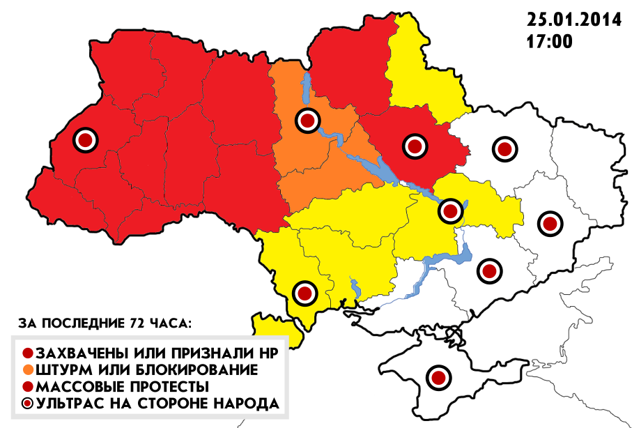 Интересно, кого Янукович назначит Гитлером? Затишье перед бурей. 14:30 В киевской больнице скончался 45-летний житель Яворивщины Роман Сеник, который был тяжело ранен 22 января на улице Грушевского. За его жизнь боролись несколько дней, но раны оказались очень тяжелыми: у него было тяжелое ранение в легкие, перенес несколько операций, пришлось ампутировать руку... 16:14 Депутаты Верховной Рады от правящей партии начали вывозить за границу своих родных. По данным информагентства, делается это не только из-за угрозы их безопасности, но и из-за давления внутри партии. На 25 января назначена встреча руководства партии с регионалами, на которой, как рассказывают источники, депутаты должны обеспечить голоса за введение чрезвычайного положения в стране. Однако не все депутаты желают брать на себя ответственность за подобные решения, поэтому хотят обязопасить семьи и близких, вывозя их за границу. 17:32 После нескольких часов затишья демонстранты вновь перешли к активным действиям. Как сообщает РИА Новости, протестующие начали кидать в силовиков куски брусчатки, в ответ "Беркут" периодически бросает светошумовые гранаты. Кроме того, активисты продолжают жечь автомобильные покрышки, дым на Грушевского сгущается. Силовики снова пытаются потушить огонь. Один из протестующих с помощью устройства, усиливающего звук, обращается к силовикам с призывом "прекратить поливать громадян холодной водой" и перейти на сторону народа... http://www.novayagazeta.ru/news/287394.html Ранее вечером из кордона милиции был выдернут "беркутовец". Сейчас "беркутовец" госпитализирован. Однако, буквально пол часа назад еще двух "беркутовцев", которые отстали от своего отряда во время неудачной вылазки "силовиков", было также задержано демонстрантами. Ивано-Франковск  | 8:20p |