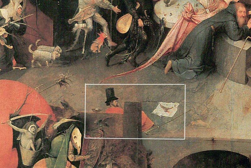 Изучаем Босха Иероним Босх (1450-1516) во всех отношениях чрезвычайно загадочный художник. Например тщательно изучая его картину "Искушение святого Антония" (1505) из португальского музея, я обратил внимание на странную фигуру путешественника во времени в алом плаще и высоком черном цилиндре, какие носили в Париже в 19 веке. Этот персонаж удивительно напоминает художника Мане с изящной французской бородкой. Сидит он на картине непринужденно развалясь и перед ним на