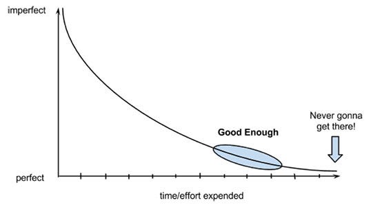 Это все хорошо, оба принципа классные. Только они разве не полностью противоположны по смыслу ? В одном случае мы говорим, что нельзя останавливаться, и надо жать до упора, забивать на хорошее ради лучшего. А во втором случае наоборот, забивать на лучшее ради хорошего. На самом деле разница тут только в конечном результате, и то как он улучшается. Если конечный результат (он же целевая функция) с каждым нашим шагом становится все лучше и лучше (например, по экспоненте), то останавливаться ни в коем случае нельзя. Если наоборот, мы вышли на режим насыщения, и чем дальше мы продвигаемся, тем меньше получается прирост общего качества результата, значит надо останавливаться, а не упираться.