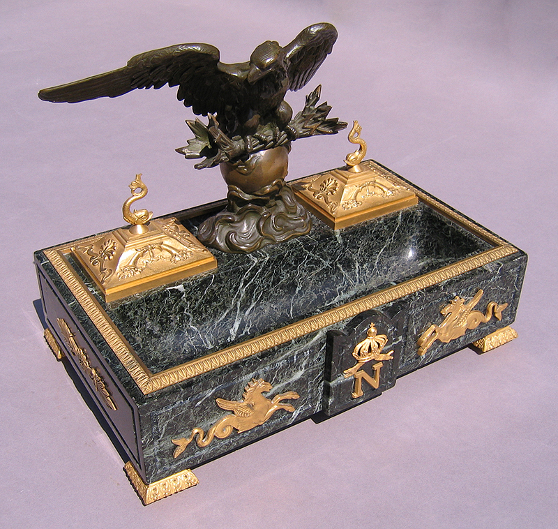 Старинные письменные принадлежости. Часть 2. Драгоценные старинные письменные принадлежостиЦарские и королевские, золотые и серебряные, из слоновой кости и черепахи, инкрустированные... Блокноты, золотая и серебряная готовальни, чернильные приборы,настольные кабинеты, витринки и ящички для мелочей и многое другое из того, что держали на письменных столах. ![]() Чернильница Palais Royale Inkstand, Early 20th Century, French ![]() ANTIQUE BOULLE DOUBLE INKWELL, FIGURAL BRONZE INKSTAND --------------Царские письменные принадлежности---------------------- ![]() Чернильница в виде софы Гелиотроп, перламутр, золото; резьба, чеканка, полировка. 18.3х5.8х10.7 см Франция. Париж. Конец 18 в. ![]() Печать с вензелем императрицы Елизаветы Петровны Золото, серебро, бриллианты, горный хрусталь; резьба, чеканка, гравировка. 2.7х2.7 см Россия. Санкт-Петербург. Середина 18 в ![]() Чернильница в виде петуха Серебро, нефрит, синтетические рубины; литье, чеканка. Выс. 18.3 см ![]() Чернильница Серебро, золото, нефрит, рубин, бриллианты; литье, резьба, чеканка, гравировка, эмаль. 8.6х6.7х6.7 см Афанасьев, Федор. Фирма 'Фаберже' Россия. Санкт-Петербург. 1900-е гг. ![]() Готовальня Медные сплавы; чеканка, золочение. Дл. 8 см Западная Европа. Между 1750 - 1760 гг. ![]() Спичечница Золото, железо, эмаль; роспись. 4.7х0.7 см Франция. Париж. 1900-е гг. ![]() Готовальня Золото, серебро, сталь, кость, алмаз; чеканка, полировка, пунцирование, гравировка. 9.7х3.7х1.9 см Великобритания. Лондон. Середина 18 в. ![]() Бюро настольное Россия, Первая четверть 18 в. Дерево, мастика; роспись, лак. 43х36х17 см ![]() Шифр с вензелем Екатерины II Золото, серебро, бриллианты; чеканка. 7.3х3.3 см Россия. Санкт-Петербург. Между 1770-1780 гг. ![]() Бюро настольное Россия, Санкт-Петербург. Середина 19 в. Орех, фарфор; резьба, роспись. 21х24.6х16 см ![]() Кабинет настольный Великобритания, 1840е - 1850-е гг. Папье-маше, перламутр; инкрустация, роспись маслом, лак. 41х33.5х41 см ---------------Карне и блокноты----------------------- Карне - миниатюрная плоская коробочка, чаще всего прямоугольной формы, для хранения грифеля и пластинок из слоновой кости или перламутра. На них во время бала, в театре и т. п. было принято писать записки, обычно куртуазного содержания. Карне Золото,серебро,бриллианты,розы,изумруды, Франция. Париж. 1770-е гг. Источник поступления в музей: Императорская галерея драгоценностей. До 1859 г. ![]() Золотое карне, покрытое прозрачной синей эмалью по гильошированному (гравированному) фону, было преподнесено императрице Екатерине II князем Г.А. Потемкиным. Оно имеет декор из полужемчуга, опалов, изумрудов и надпись, выполненную алмазами с двух сторон: "НАПОМИНАНИЕ" - "БЛАГОДАРНОСТИ". Лицевая и оборотная стороны футляра украшены медальонами расписной эмали. На одном богиня мудрости Минерва венчает лавровым венком портрет Екатерины II, поддерживаемый коленопреклоненным богом времени Хроносом, и муза истории Клио с раскрытой книгой. На втором - изображение фигур воина и гения Славы перед жертвенником с надписью: "Тобою восхожу". ![]() Карне с портретом великой княгини Марии Федоровны Золото, стекло, эмаль, кость, миниатюра; гравировка, гильошировка, роспись. 9.8х6х1 см Россия. Санкт-Петербург. Около 1780 г. ![]() Карне Золото, серебро, бриллианты, бумага, ткань; чеканка, полировка. 8.8х6.3 см Великобритания (?). Вторая половина 18 в ------------Еще драгоценные блокноты и карне------------ A French gold and abolone aide memoire, with beautiful sketches of lockets of hair. 3.5in (9cm) long, c1840 A silk-lined gold-mounted Continental enamel aide-memoire, depicting architectural scen