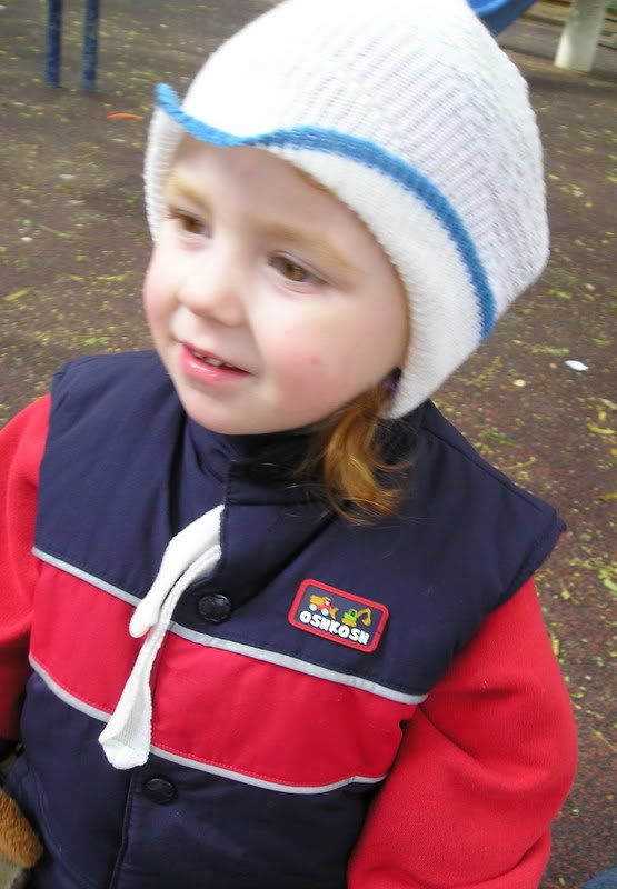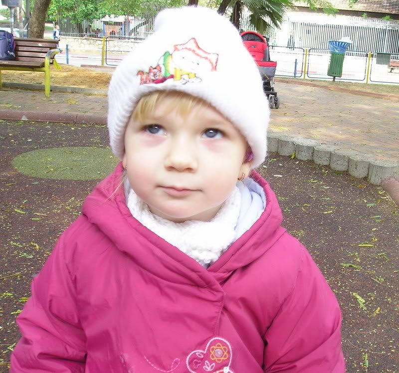 Полина. Вот так вот она сделала себе шапку и все время следила, чтоб положение шапки было именно такое. Я пару раз порывалась поправить шапку, но ребенок после моего поправления поправлял, чтоб было так: