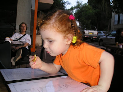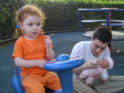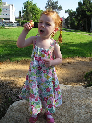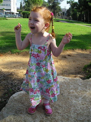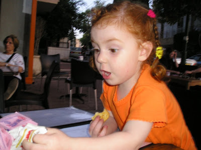 Гиватайм или Тель Авив (переход одной улицы уже ничего не значит:)) В парке на горке. Кайф - после дневного сна в поезде самое то:)) еще фото:на площадке чуваки: А вот в сарафане, до его смены на брюки (чтоб с горки удобнее было кататься переодели): Гиватайм. Кафе. Изучает меню:Вдруг обнаружила сахар: