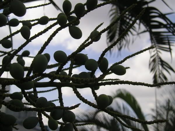 Август-облака Появились облака! Урра!теперь можно по утрам спрашивать ребенка: "Как ты думаешь, будет дождик или нет?":)))теперь не так уж скучно смотреть в окно маршрутки, когда видно небо, и вообще, скоро осень!так пальма плодоносит:)А так не знаю что за дерево цветет:)готовимся к осени