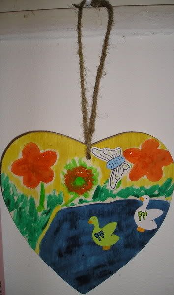 и еще одно творческое: делали вместе - Полина красила озеро для гусей и вместе со мной держась за кисточу делала цветочки. Остальное украшательство мое. Материал - деревяшки и гуашь:)
