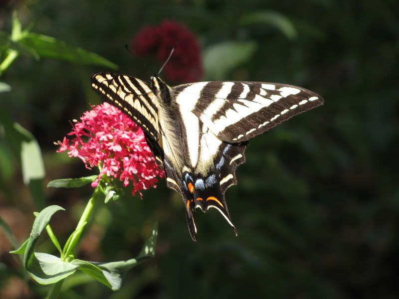 Бабочка с ладонь мою, Полина просто обалдела от одного ее вида! поймать в руки не решились (я боялась 2 вещей: что бабочка слишком щекочучая и что крылья ей поламаем, пока будем пытаться удержать...) ничего сладкого не было, чтобы охоту на нее организовать;) наслаждались ползая по тротуару около цветов, а я пыталась поймать в фотоаппарат эту красоту, но был ощутимый ветер...