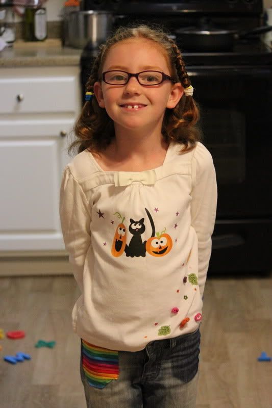 /штанцы и майка экслюзив! на майке термо-аппликация хэлоиновская, а на штанах разноцветные нашлепки на "карманы" я сама пришивала, поэтому криво там чуть-чуть, ну и рисунок на коленках есть, но его не видно тут/