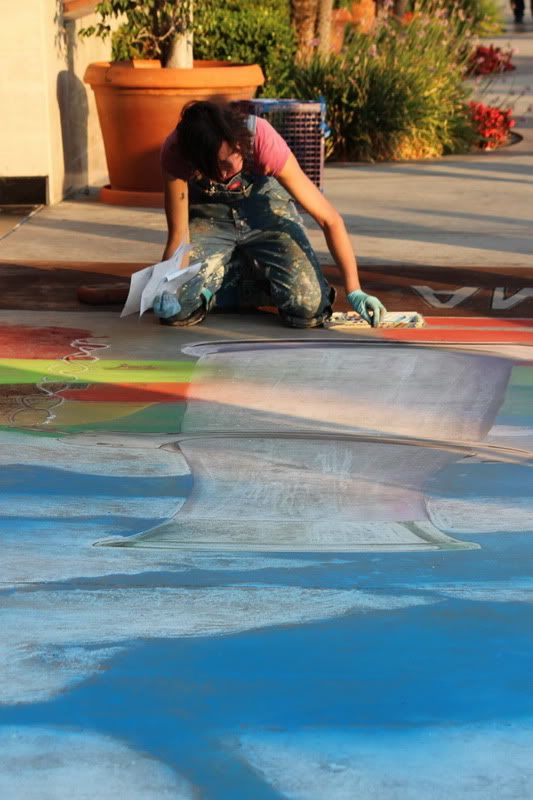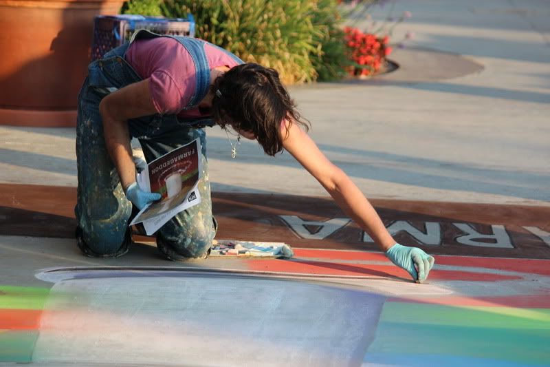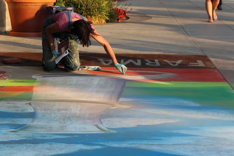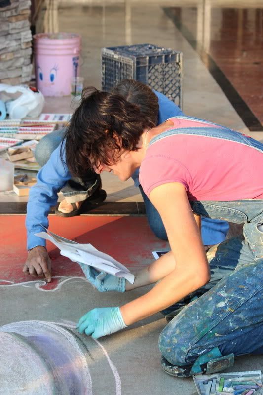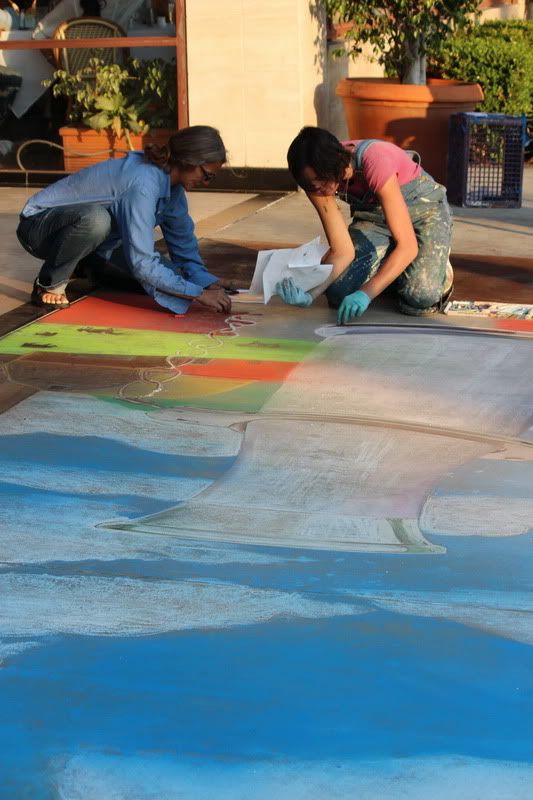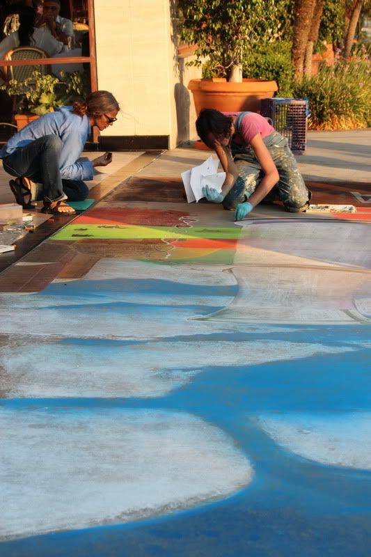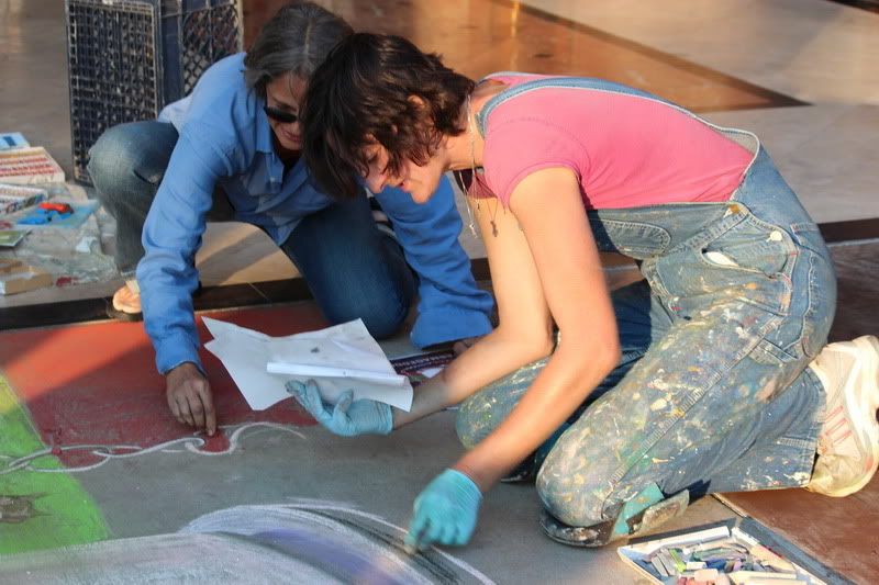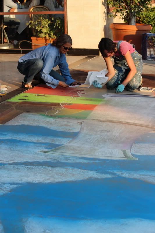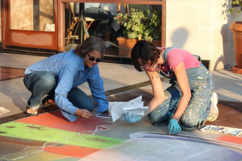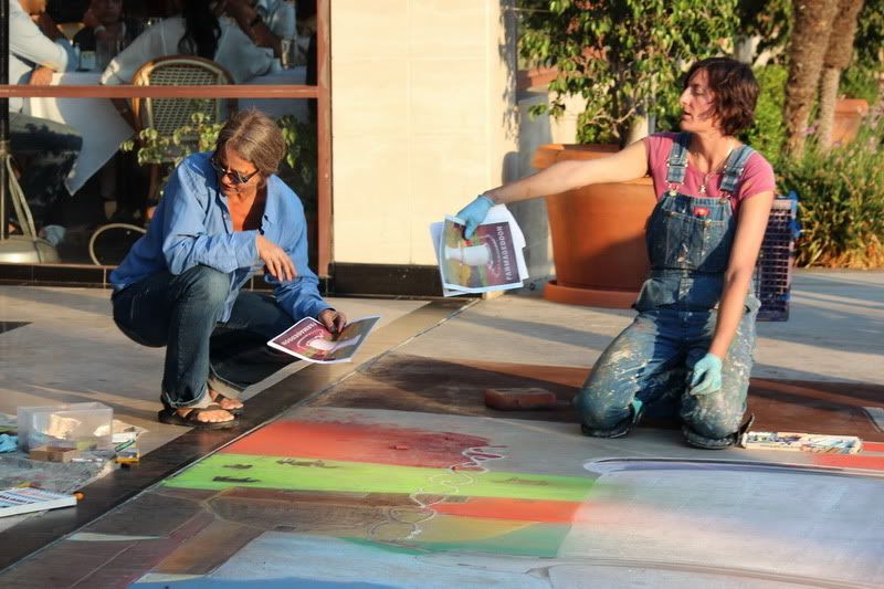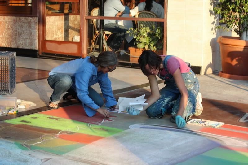как две теточки рисуют рекламу мелом перед входом в заведение...