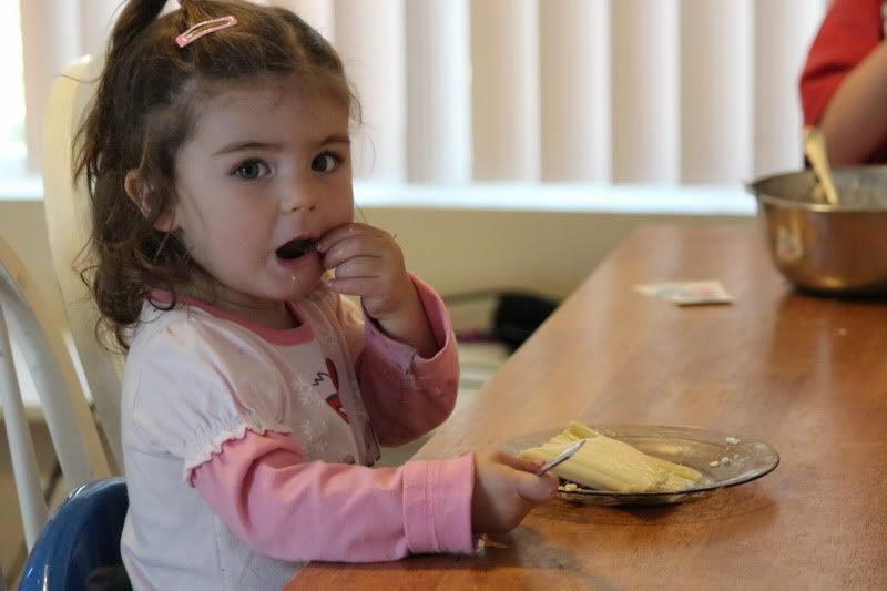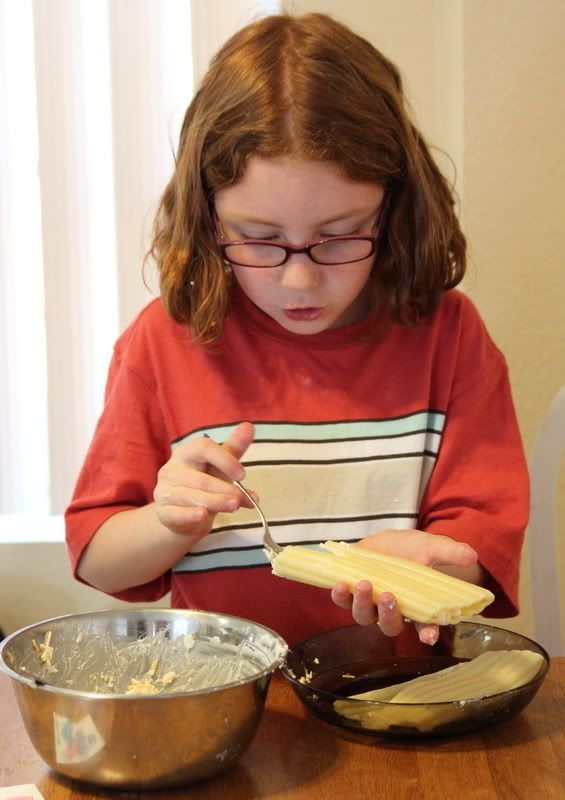 это ее любимое - макароны и сыр. Тока это не обычные макароны, а огромные. И сыр, перемешанный с котэджем и сметаной она ложкой запихивает внутрь макаронины, а потом уже только ест;)