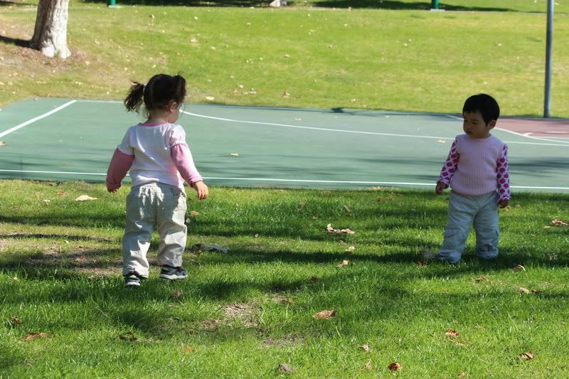 с девочкой тоже, коллега - гуляет там же;) с братом близнецом и бабушкой обычно.
