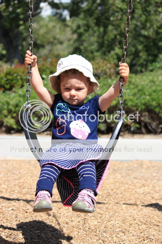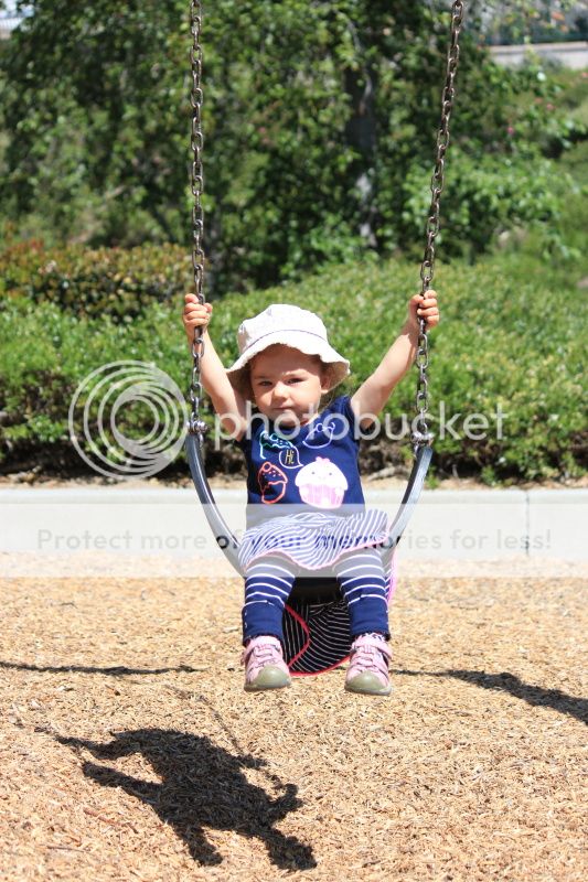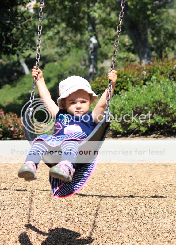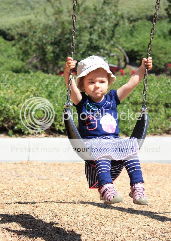 научилась кататься на взрослой качеле. раскачивать себя сильно еще не может, а все туда же...