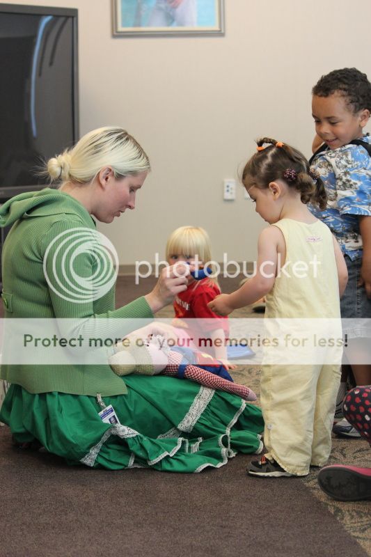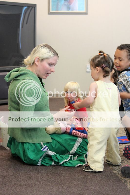 У библиотекарши есть куклы, которые она использует в рассказах и песенках. Этот дядька был тот, которые пел ник-нак на разных предметах, названия которых рифмуется с цифрами. Еве досталось колено knee - three :)