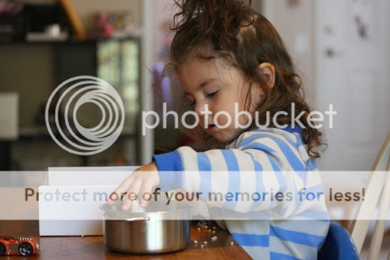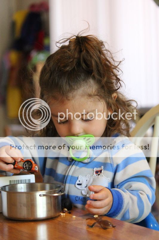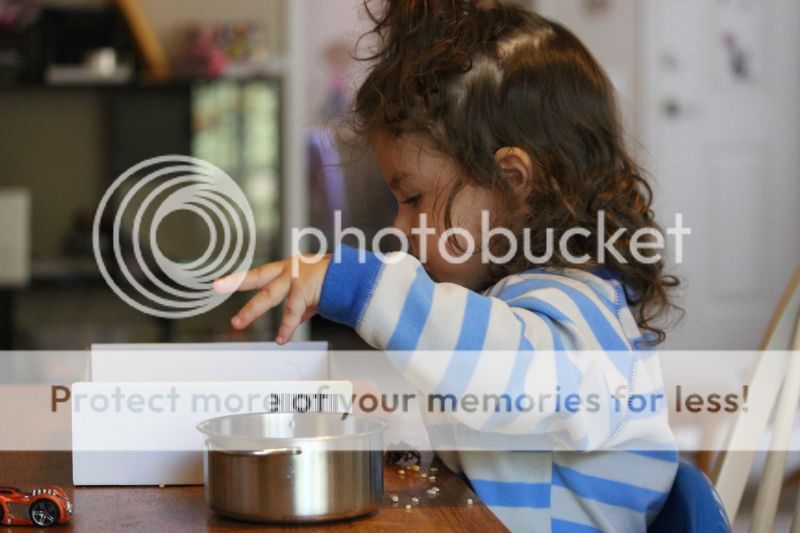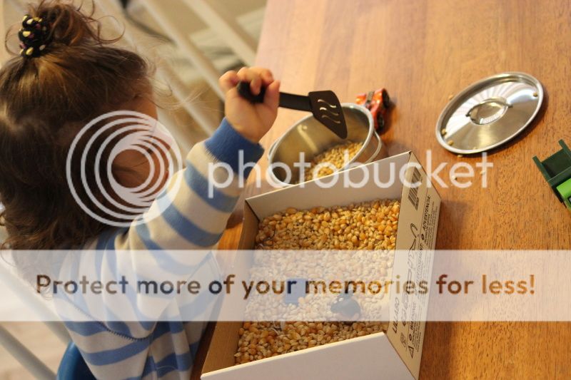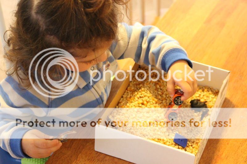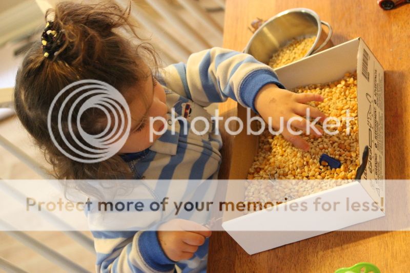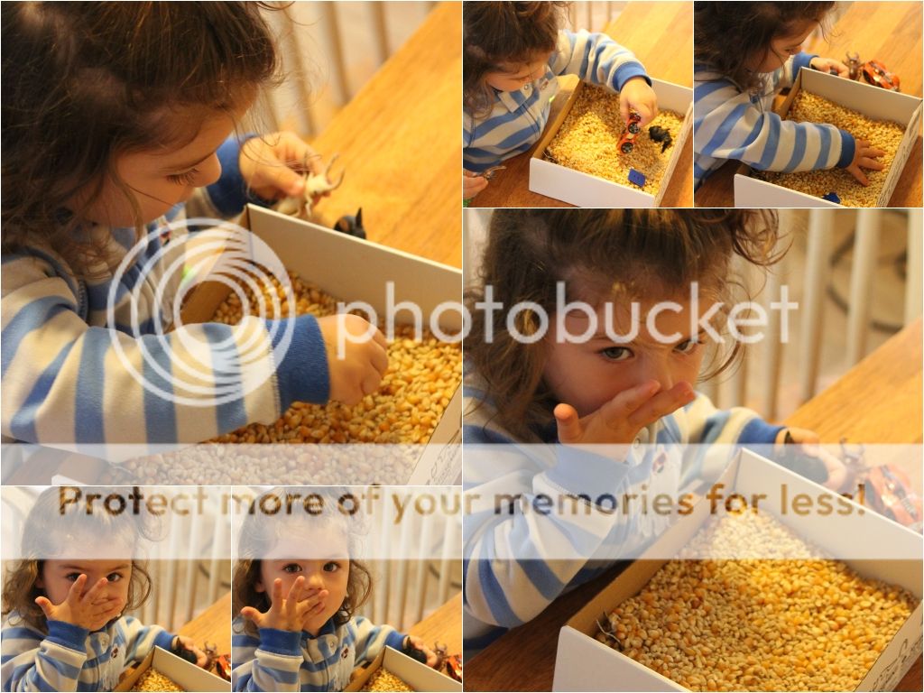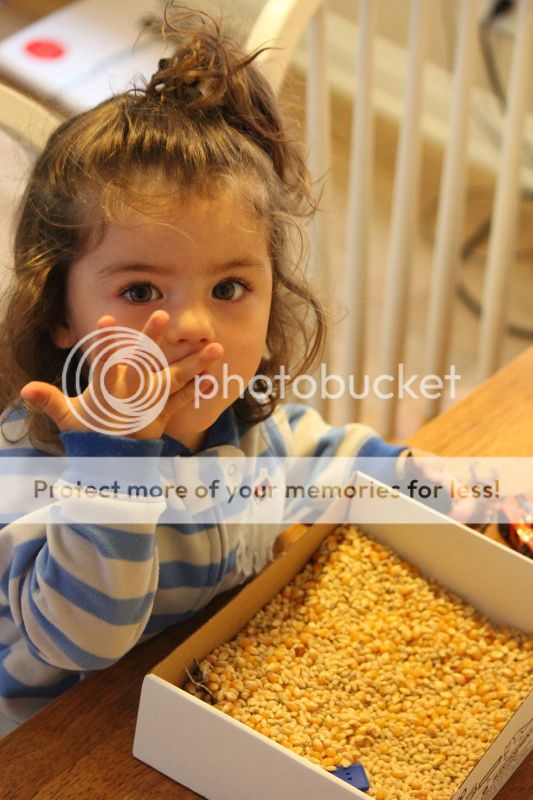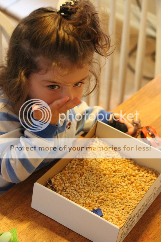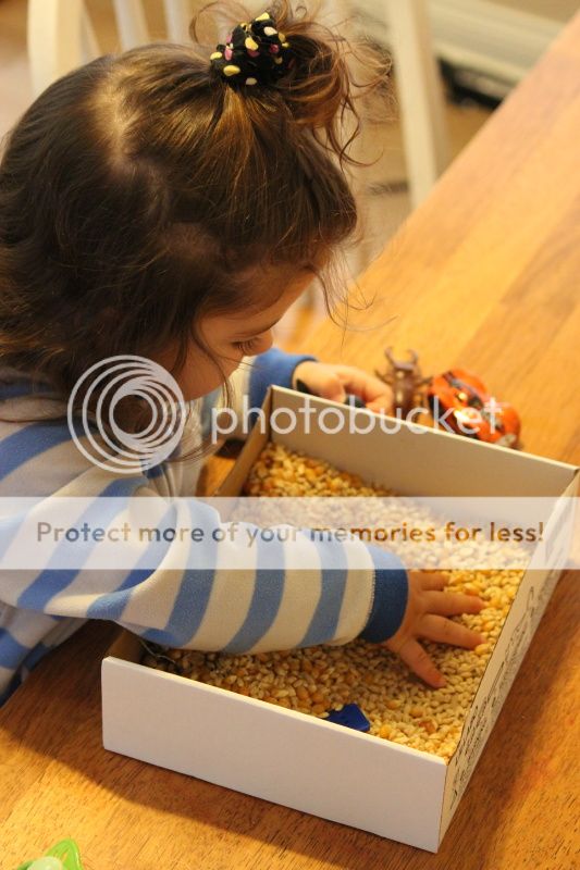 понаделала я тут Еве "коробочку-песочницу" с зерновыми культурами... это меня так кукурузная песочница в СанХуанКапистрано вдохновила и коробка подходящая нашлась от деревянной паравозной дороги Икеевской...