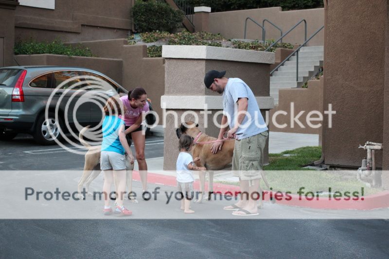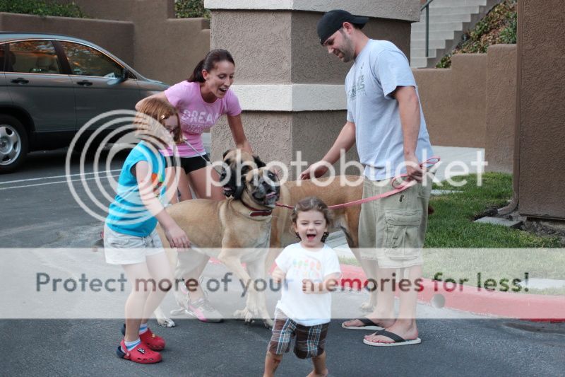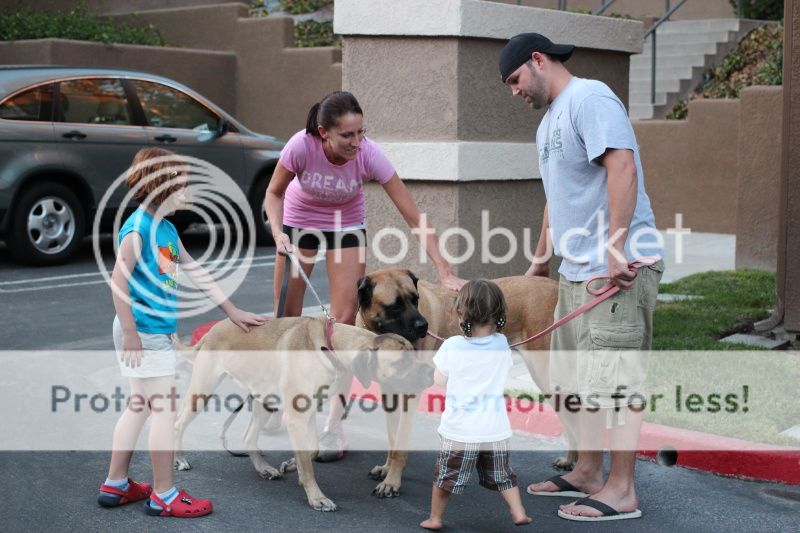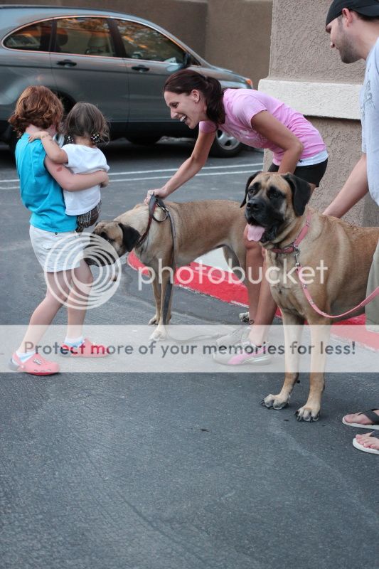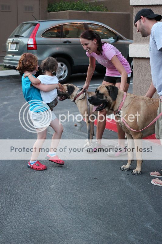 но требует гладить;) Полина вот ее на руки взяла, чтобы спасти от попыток облизать, и они обе гладят этих огроменных собак;)