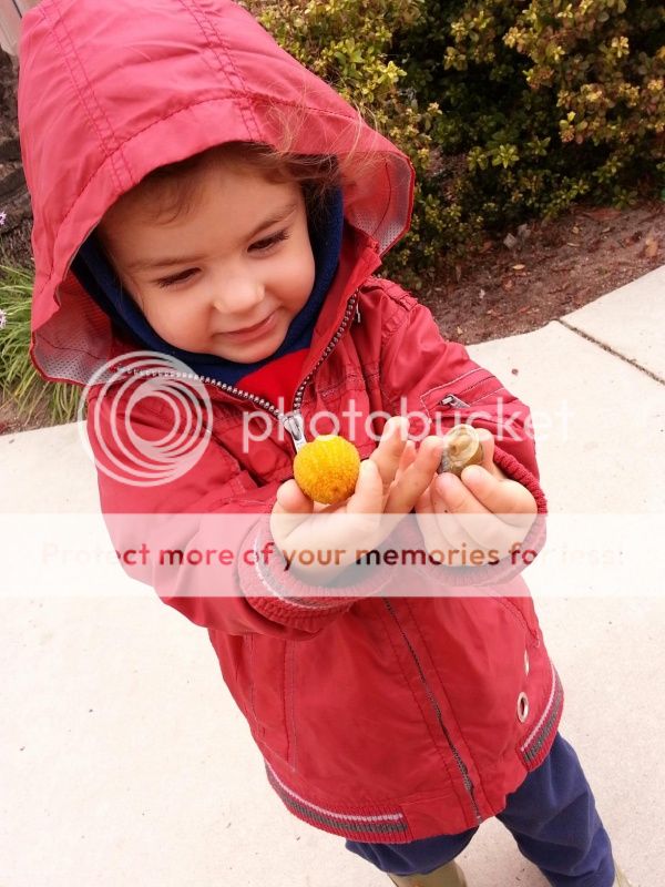 улитка себя расчуствовала комфортно у мелкой Фурии в ладошке, выпустила рожки, начала ползти в рукав и, конечно же, накакала на руку и на рукав... /хорошо, что у нас несколько курток и дождевиков, иначе не гулять на на улице.../