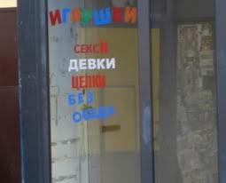 Скучающий мальчик, продающий ДВД у метро, переклеил буковки на заброшенном ларьке с игрушками.