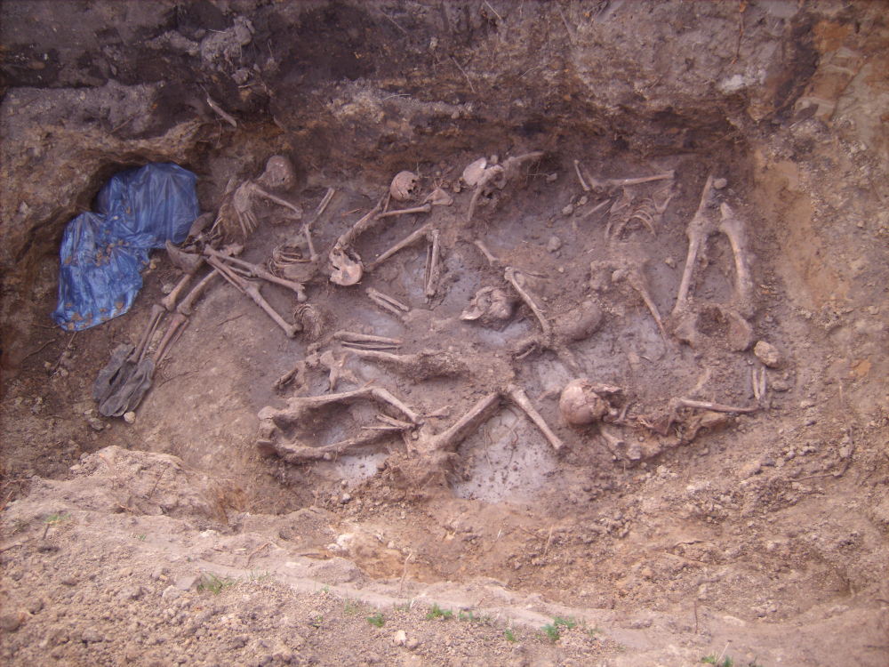 Жёсткая фотосессия раскопа.  «В октябре 41-го в полутора километрах отсюда находился немецкий сборный фильтрационный лагерь, — рассказывает координатор областного поискового отряда «Брянский фронт» Максим Волков. — Тех людей, что могли передвигаться, отправляли колоннами в Брянск, на 111-й военный завод, раненым скручивали руки и ноги проводом, клали на подводы, привозили к оврагу и зверски добивали — прикладом по голове. Практически у всех, кого мы нашли в урочище, проломлены черепа…». Егор Пулин, когда началась война, ходил в детский сад. Он был совсем еще ребенком, но до сих пор перед его глазами стоит страшная картина: подходит подвода, с нее сбрасывают тела. Выстрелы. Глубокая яма… «Закапывали мелко, — вспоминает Егор Егорович. — Земля шевелилась… Я, хоть и маленький был, но все видел и помню до сих пор. Отец мой сразу понял, что пора уходить, а то и нас убьют. Одному человеку удалось выбраться из-под земли, он дошел до соседнего села, но его предали. И расстреляли. Я многим рассказывал, что знаю место, где лежат десятки людей, но меня никто не слушал. И только в этом году ребята все проверили, я им точно показал, где все было…». В первых трех ямах лежат солдаты и офицеры — там нашли военные ремни, хромовые сапоги, ботинки. В четвертой — «гражданские», взрослые и дети, возможно, целые семьи. Кольцо, сделанное из серебряного «полтинника», в нем волосок — бережно завернуто в тряпицу, модное зеркальце, очки на плюс два, колбочка с хлором для очистки воды, перевязочный пакет… Обо всех этих предметах без устали рассказывает школьник Женя Мишин — каждый день сюда, на раскопки, приезжают люди. Как только подходят к обрыву — все тут же замолкают… Это место на несколько дней стало «экскурсионным маршрутом». Сейчас ведется разведка в Севском и Стародубском районах, в Жирятино. Поисковики проверяют информацию, которую узнали от местных жителей зимой. В Севске уже найдено двадцать медальонов, сорок солдат, под Стародубом — больше сотни. «Вахта Памяти Брянской области» продолжается. Это, естественно, официальная версия. Но что там да как - широкая общественность с нашей помощью узнает. Далее со слов участника. UPD еще про поиск и подъем наших солдатИтак, почищена расстрельная ямка номер три. В ней - солдаты, сержанты и офицеры РККА. Официально. А не совсем - чегото там лежало, в самом низу, два скелета в немецких кителях. С сорваными погонами. С чего бы это? Обратите внимание на солдата слева, с руками под грудью, и характерным расположением рук и лопаток. Так делают, когда хотят с того света выбратся. Чтоб воздух сохранить, когда тебя расстреляного засыпают. У этого невышло. Земля им пухом. ( +Много карточек разрешением 1000х750 )
