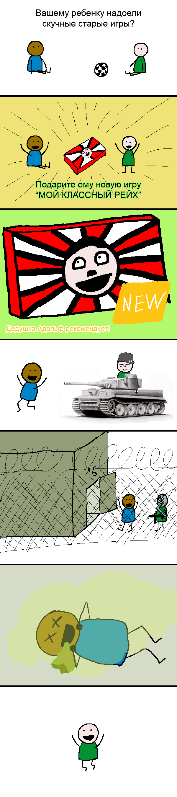 Купи ребёнку Холокостиков =) bgfan@lj :"(шокированно) Настольная игра "Холокостики". Наткнулся случайно на статью про дизайнера игр Бренду Бретвайт(Brenda Brathwaite). И несколько ее игр. Ключевая, конечно - игра Поезд(Train). ![]() Игроки сажают желтых человечков в черные вагоны и передвигают по рельсам. По ходу действия вытягивая карточки действий. Можно изменять скорость вагончиков, пополнять/разгружать вагончики, устраивать другим игрокам препятствия на пути... Кто первым довез вагончик до конца дороги - тот и выиграл. Ему сообщают, что в вагончике он вез евреев в Освенцим. И другие игры этого дизайнера такие же душевные. Типа перевозки черных рабов из Африки в Америку. Сперва игрок должен собирать (любовно) семьи, потом он их грузит на лодку, а потом выясняется, что до конца пути жратвы на всех не хватит, и кого-то надо с лодки выбросить." Первоисточник по наводке chelapeuka2@lj |