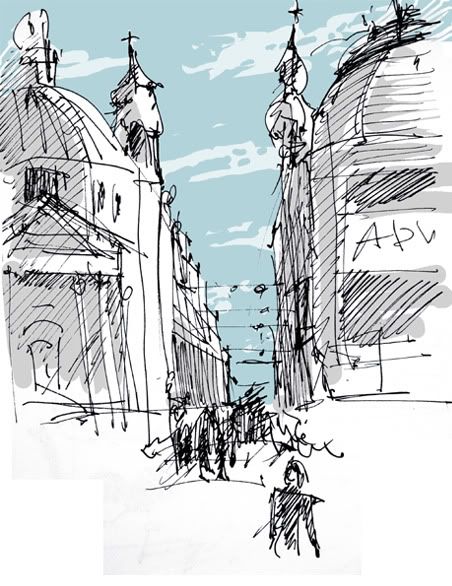 Piazzo del Popolo: Та же площадь; люди сидят на ступеньках фонтана и смотят на человека-статую. Мне как-то больно наблюдать за людьми, зарабатывабщими стоя неподвидно в странных костюмах, слишком стойкие ассоциации с живой мебелью из "120 дней Содома", слишком мало человеческого: