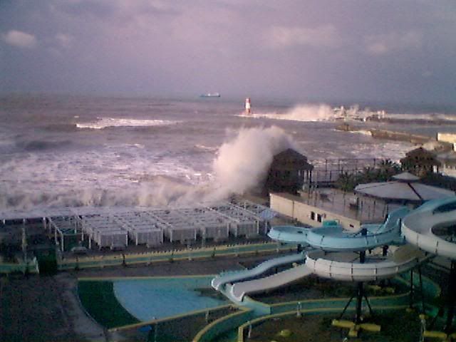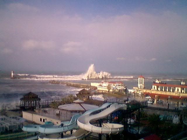 А при ударе волны в бетонную косу, которая отгораживает акваторию порта, волна поднимается выше маяка!!!