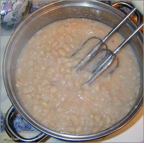 Пока наша заправка настаивается сама в себе, хватаем миксер, и запихиваем его в фасоль. Нужно добиться того, чтобы в однородной фасолевой каше примерно 50% было неразбитых фасолин.