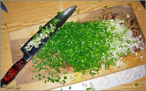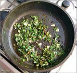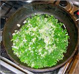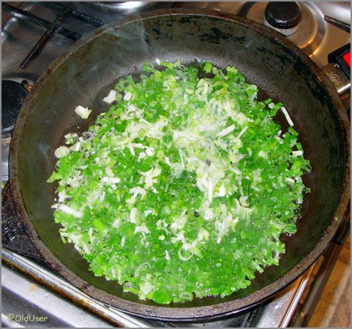 Как только лук обжарится, выключаем плиту, и в горячее масло с луком закидываем нарубленную зелень. Ее жарить уже не надо!!! Она просто должна попасть в горячее масло. Перемешать!