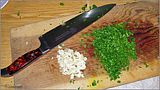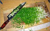 И пока он обжаривается мелко рубим всю оставшуюся зелень. Петрушку, чеснок, укроп и кинзу.