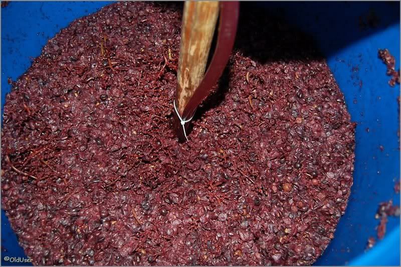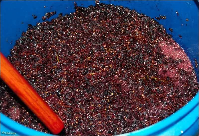 После того, как все приведено в соответствие, прикрываем бочку листом фанеры (не вздумайте закрыть герметично - все взорвется! и не вздумайте оставить открытую - набежит насекомых - устанете вылавливать!) и трижды в день (утром, в обед и вечером) инструментом типа "швабра деревянная новая" тщательно все перемешиваем. Особо следим за тем, чтобы шапка жмыха (мезга) перемешивалась и тонула в соке. Если этого не сделать - закиснет. Дня через три начинаем пробовать. На наших глазах сок набирает цвет, терпкость, градус. Нам нужно поймать момент, когда спирта станет процентов 8, и на вкус явно будет ощущаться алкоголь. В этот момент фаза бурного брожения почти прекратится. Занимает этот процесс примерно пять-семь дней. Зависит от многих факторов.
