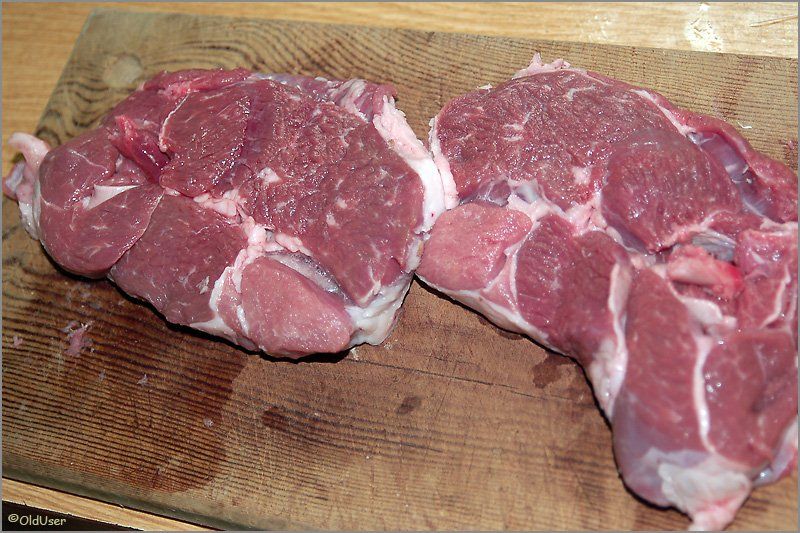 Что нам понадобится? Во-первых баранина. У меня было два куска грамм по 400-500 каждый. С баранины мы уберем лишние пленки и жир.
