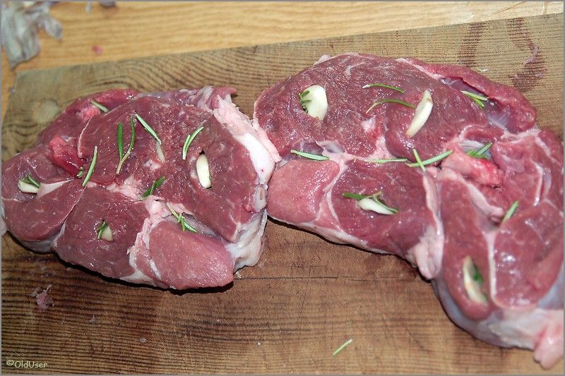 Зубчики чеснока режем на пластинки, в мясе делаем прорези и напихиваем туда пластинки чеснока и листики розмарина. С розмарином не переборщите. Баранина его любит, но не в огромных количествах.