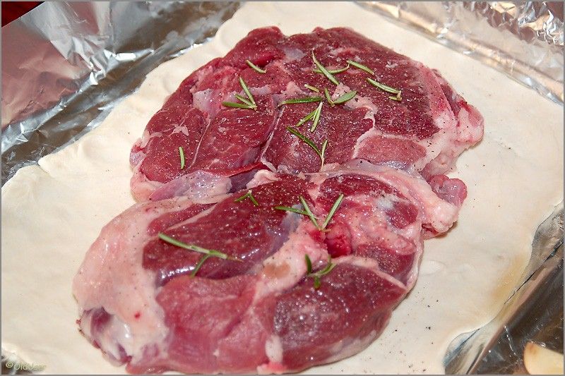 Солим и перчим мясо. На противень укладываем кусок слоеного теста такого размера, чтобы на нем поместилось мясо. Кладем мясо на тесто, не забыв поперчить, посолить и посыпать розмарином с другой стороны кусков.