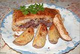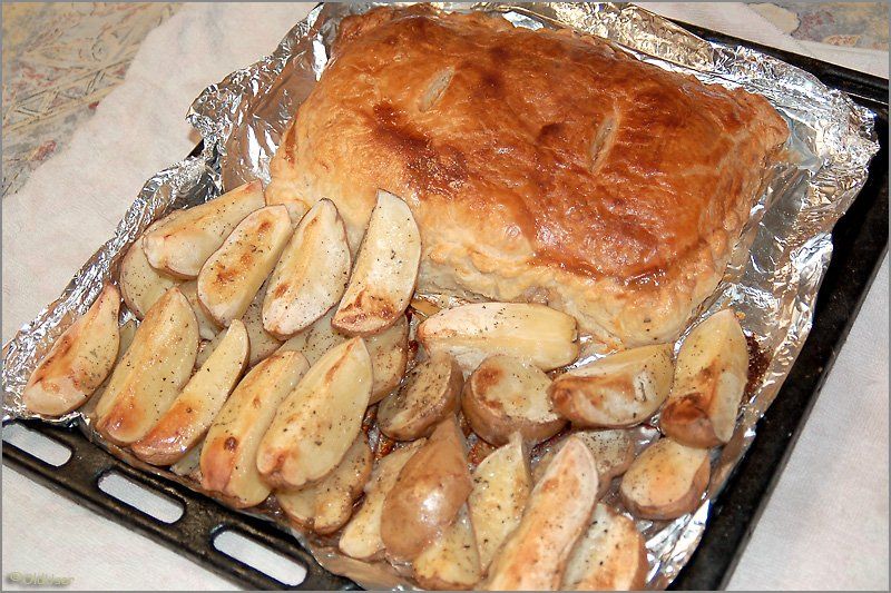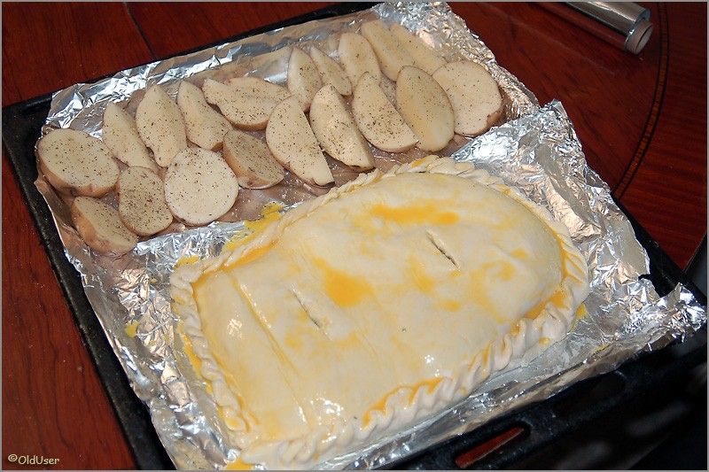Накрываем мясо вторым куском теста, и, смочив края водой, тщательно защипываем тесто по кругу. Потом делаем вверху две прорези, мажем взбитым яйцом, и укладываем на противень рядом с мясом крупно порезанную картошку. Она у нас будет гарниром. Не хотите - не кладите. Не обязательно. Но если будете делать, то посолите картошку, поперчите, и посыпьте орегано. Картошку можно положить и "в два этажа".