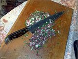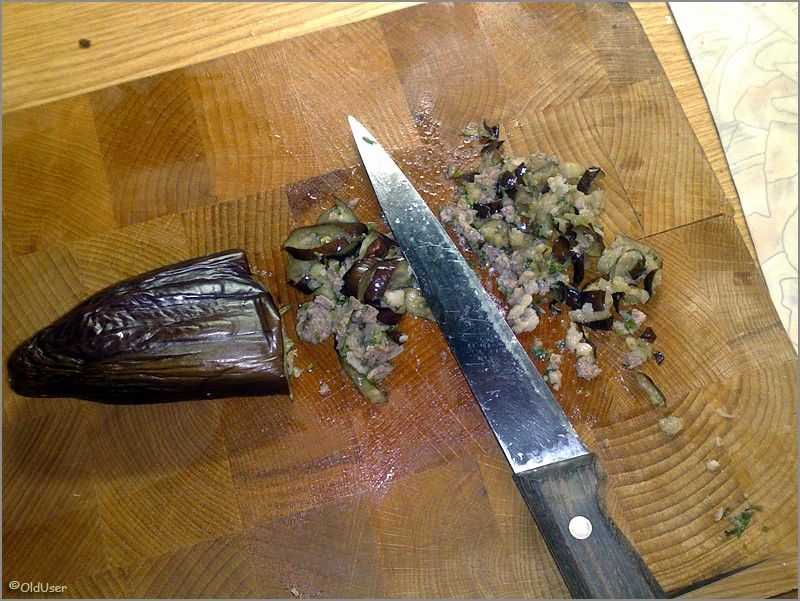 Достаем их, опять берем в руки доску и острый-острый нож, и, выкинув пробку нафик, мелко-мелко шинкуем эти баклажаны вместе с их содержимым.