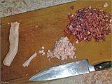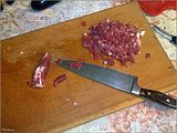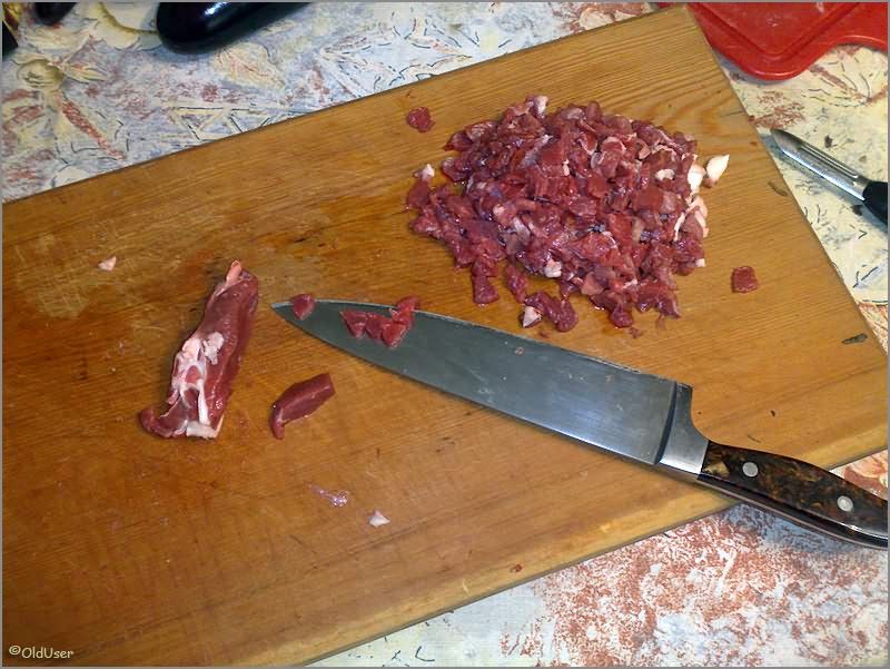 При выполнении этой операции, да и всех других, нужно быть очень аккуратным, чтобы не повредить баклажан. Он очень легко лопается, а нам это совсем не нужно. Нам нужно, чтобы баклажан оставался целым до самого конца приготовления. После того, как мы подготовили все имеющиеся баклажаны, Начинаем делать начинку (каламбур получился). Для начинки берем жирное мясо. Или мясо и сало. В общем нам нужно чтобы сала было как минимум вполовину от мяса по объему. Мясо может быть любой породы. Я использовал баранину. Берем острый нож, и режем мясо как можно мельче. Если лень, мне кажется, можно и через мясорубку пропустить. Но, так как объем тут небольшой, то резать ножом - времени много не уйдет. Тем более, что начинку можно делать параллельно с колупанием баклажанов, если есть помощники. Итак, режем. Мелко-мелко. Сколько? А прикиньте сами, сколько вы свожете запихать в баклажаны, так, чтобы они не порвались.