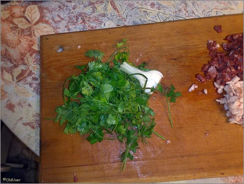 Примерно от половины до двух третей от объема мяса. Так же мелко его шинкуем. И туда же нам понадобится зелень. Здесь есть базовая позиция - кинза. К ней добавляйте что-нибудь на свой вкус. Я добавил петрушки, укропа, и, так как баранина любит чеснок и розмарин, то и их тоже пошинковал.