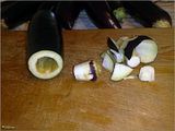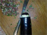У каждого баклажана отрезаем жопки. Которые с черенком. Сантиметров по пять отрезаем. В самом баклажане, любым удобным способом вырезаем середину. Максимально возможной глубины. Делаем из него как бы емкость. Я вырезал такой штучкой, которой из яблок удаляют сердцевину. Удобно оказалось. А отрезаные жопки "обтачиваем", чтобы ими можно было плотно заткнуть дырку в баклажане, после того, как мы в него напихаем то, что надо.