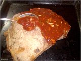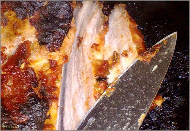Поднимаем температуру в духовке градусов до 180-200 и кидаем туда обмазанное соусом мясо еще на час-полтора. Потом достаем, очищаем от пригоревшего соуса, остужаем, кладем в холодильник, и, когда оно остынет, мы его того. В смысле кушаем.