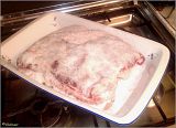 Потом берем крупную соль и со всех сторон тщательно обмазываем ей брюшину. Толстым слоем. И оставляем как минимум на четыре часа. Мне рекомендовали оставить на ночь. Не нужно бояться, что пересолится. Соли она возьмет не больше чем нужно.