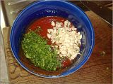 Как только процесс выдержки закончен, снимаем избытки соли с мяса, разогреваем духовку до 150°С и укладываем туда наш кусок. На полчаса. Через полчаса мы его переворачиваем и оставляем еще на полчаса. И так - каждые полчаса в течение двух часов. Пока духовка занята и мясу не до нас, мы берем грамм двести-триста томатного соуса по-грузински, туда добавляем мелко порубленный чеснок, в количестве четырех-пяти зубчиков, и горсточку порубленой кинзы. Перемешиваем, пусть настаивается.