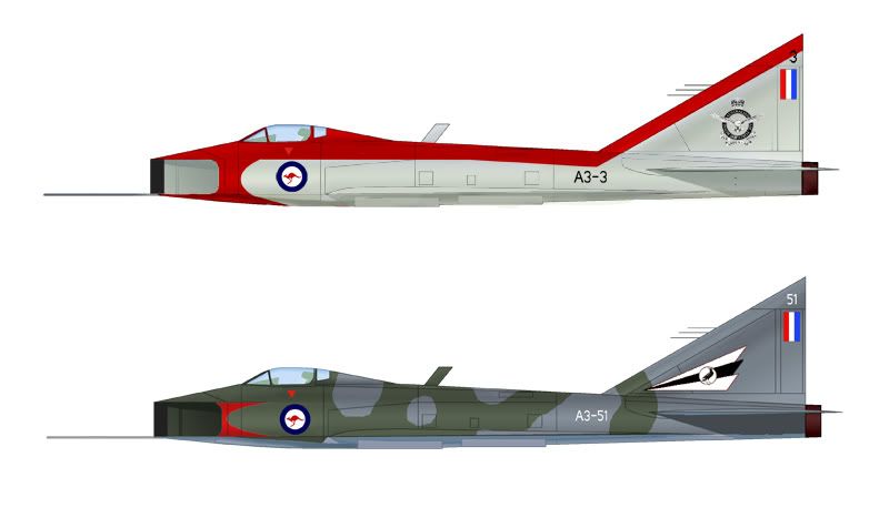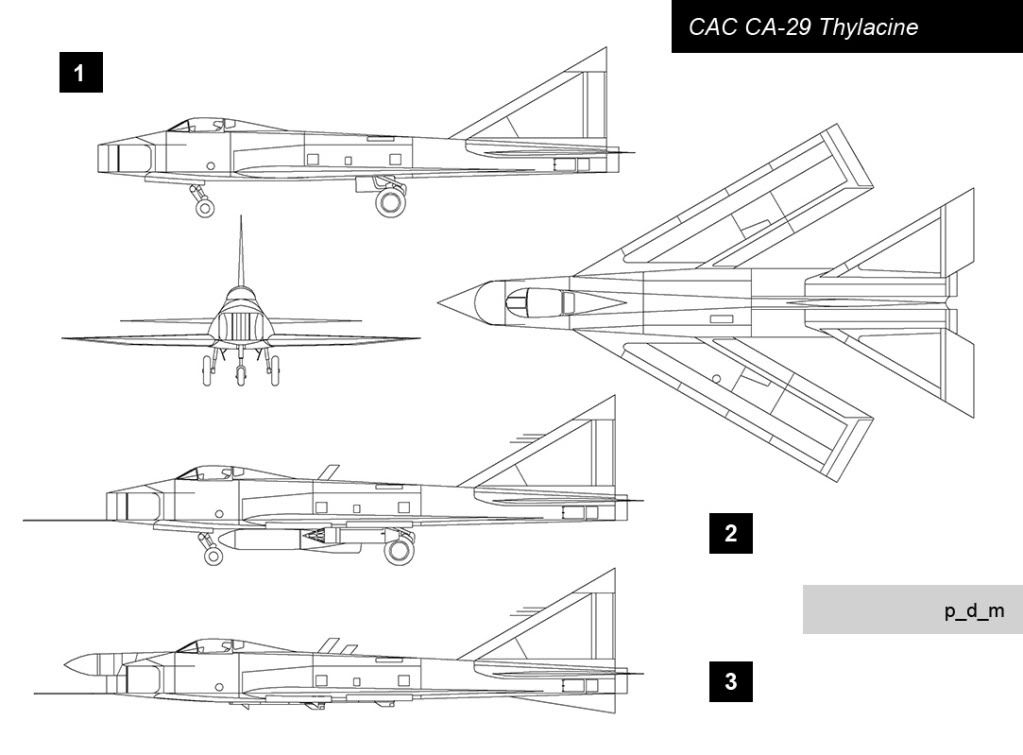 Альтернатива. Истребитель от антиподов - CAC CA-29 Thylacine ![]() Сумчатый волк - Тилацин Рисуем, разукрашиваем и выдумываем героя 50х, может быть даже символ реактивной авиации того времени - "трубу". "Труба" с классическим конусом в носовом воздухозаборнике - это банально, это не наш метод. Наша "труба" будет "с клиньями". С регулируемым плоским воздухозаборником с клиновидным центральным телом, по образцу Е-8 например. "Клинская труба" была смело зачислена в австралийцы. Австралийский авиапром послевоенного периода не достиг таких высот, как канадский, или может быть даже южноафриканский. Однако и осси не сидели без дела. Про XP-65 и CAC CA-31 были посты, вот еще несколько проектов 50хх годов: 1. CAC CA-23. Сверхзвуковой двухместный двухдвигательный всепогодный перехватчик. 1949 год. Был изготовлен даже макет этого самолета. ![]() 2. Ракетный (?) истребитель XP-47. ![]() 3. Развитие XP-65 - XP-68. ![]() Как видно порох в пороховницах имелся! Проект XP-65/XP-68 особенно привлекателен. Пойдет как легкий перехватчик, а наш драндулет - как более тяжелый самолет, двухмоторный истребитель-бомбардировщик, ему в пару. Экзотический налет приблизительного современника - английского "Лайтинга" - присутствует. Обозначение CA-29 на фирме CAC (Commonwealth Aircraft Corporation, крупнейшая авиационная компания Австралии) в реальности было присвоено лицензионному Mirage IIIE(O), производимому в Австралии с 1963. За наличием аборигенных самолетов француз не нужен. Имя собственное Thylacine/"Тилацин" есть именование вымершего (увы!) сумчатого волка. ![]() Лого C.A.C. Легенда Создание CA-29 началось в середине 1952 года в тесном сотрудничестве с EEC (English Electric, создатель Lightning). К 1954 сформировался внешний облик самолета, в начале 1957 - первый полет прототипа. Неспешно отстроили и облетали еще два прототипа для испытаний. В 1962 развернуто серийное производство, завершившееся на 60ом самолете в 1968. С 1968го в серию пошел Thylacine Mk.II с РЛС Ferranti AI.23. Причиной появления данной модификации стало долгое ожидание американских F-111C. Заказано было 24 машины. Вторая модель могла нести на дополнительном подфюзеляжном узле тактическую ядерную бомбу ATNB(Australian Tactical Nuclear Bomb). Подписание Договора о нераспространении ядерного оружия в 1970м году приостановило программу по разработке и выпуску ядерного оружия, к этому моменту выпустили всего 10 самолетов Тилацин Mk.II. Пара широких рекламных компаний самолета не увенчалась успехом - заграничных заказов так и не последовало, хотя умеренный интерес был проявлен со стороны Аргентины, ЮАР, Малайзии. Это неудивительно: хоть самолет и получился в общем удачным, но высокая цена из за малой серии и отсутствие политических дивидендов в случае принятия на вооружение снимали все плюсы. Несмотря на попытки послать эскадрилью истребителей-бомбардировщиков во Вьетнам "для показа флага" и, может быть даже, для рекламы, CA-29 так и не удалось понюхать пороха. В 1980 году последний "сумчатый" был выведен из состава RAAF. 1. CA-29 No1 (прототип); 2. Thylacine Mk.I; 3. Thylacine Mk.II. ![]() CA-29 Thylacine Mk.I оснащался австралийской версией двигателя R-R Avon двухсотой серии. Вооружение - на четырех подкрыльевых узлах подвески, плюс под фюзеляжем в полуутопленном положении - две ракеты воздух-воздух AIM-9 Sidewinder. Полезная нагрузка - 4250кг. Включала бомбы калибром до 454кг, НУР, до четырех УР Sidewinder, топливные баки. А также две стандартных для Британии 30мм пушки ADEN Mk.4. CAC CA-29 Thylacine Mk.I, 1963, рекламный воя