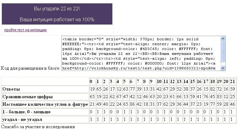 Вы угадали 16 из 22!Ваша интуиция работает на 72.727272727273%пройти тест на интуицию (http://volokhonsky.ru/test1/test.php?uid=822197795)