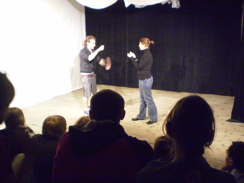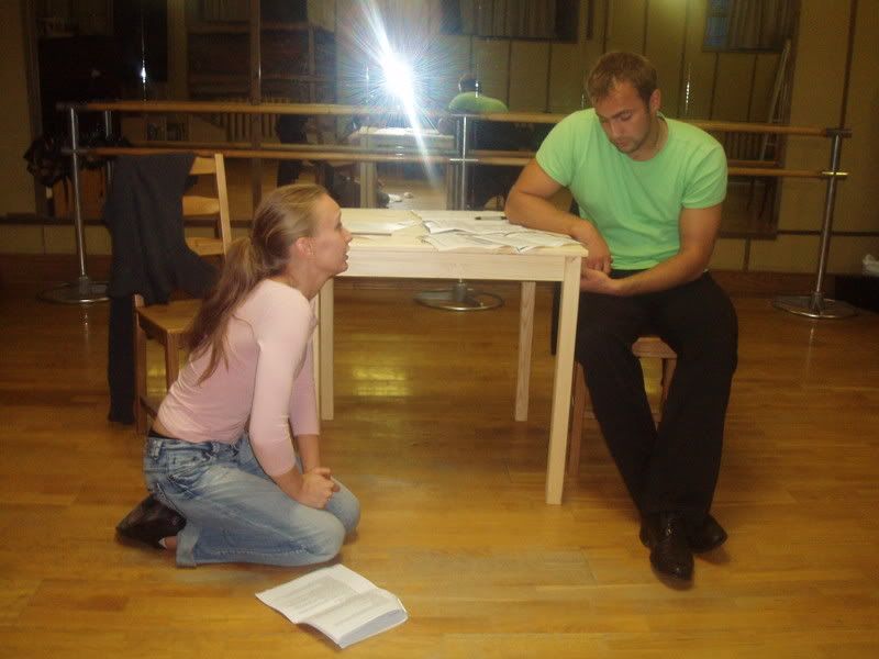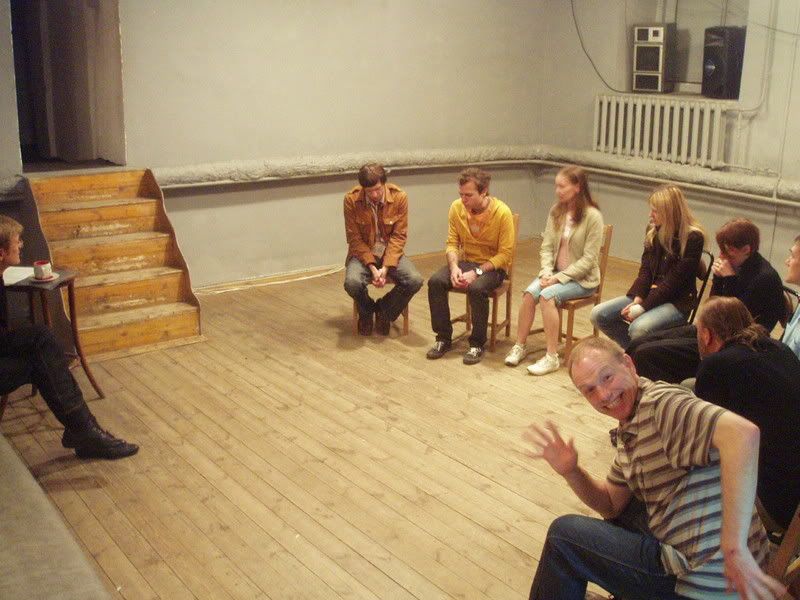 Вести с полей. Продолжается лаборатория по игровым структурам посвященная драматургии Петра Гладилина. Вчера в жесточайшем творческом экстазе схлестнулись амбиции черех команд. Четвертое почетное место заняла команда "Никаки" ( Николай Ларин, Ирина Токмакова, Марианна Дырзу). 9 минут они пытались показать профессию Аудитора, место действия Сад Эрмитаж, орудие убийтва Мотыгу. (Оценка 0,5). 12,5 мин показывали Дизайнера, Овраг и Пеликана. (Оценка 2,2). Третье (твердое) место заняла команда "Звуки муки" (Иван Тимченко, Юра Оборотов, Алина Лазарева). 12 минут ушло у них на показ Суфлера, Коммисионного магазина и Компьютерного вируса (Оценка 2). 8мин50сек потратили на Мясника, Лунный Кратер, Черепицу. (Оценка 3) Второе место честно заработала команда "Неунывающие децибеллы" (Александр Караваев, Артем Лущик, Дарья Дементьева) 8 мин Почвовед, Вулкан, Зеленка (Оценка 2) 14мин Аташе, Суэцкий Канал, Куница. (Оценка 3) Первое место решением жюри решили никому не присуждать, так как команда "Инцифалы" (Даня Ариков, Сергей Афанасьев, Олеся Поташинская) добыла его, используя инсайдерскую информацию от d_marianna . 8 мин - Маркетолог, Мыс Доброй Надежды, Негодование. (Оценка - 3) 21 мин - Социолог, Дирижабль, Предательство (Оценка - 3) Вот это, я понимаю, актеры! Вот это, я понимаю, театр! Видно на фотках азарт какой? Как на футболе, ей-Богу!  Фото trophei Current Music: из "Сибириады" | Wednesday, May 28th, 2008 | 9:44 pm |