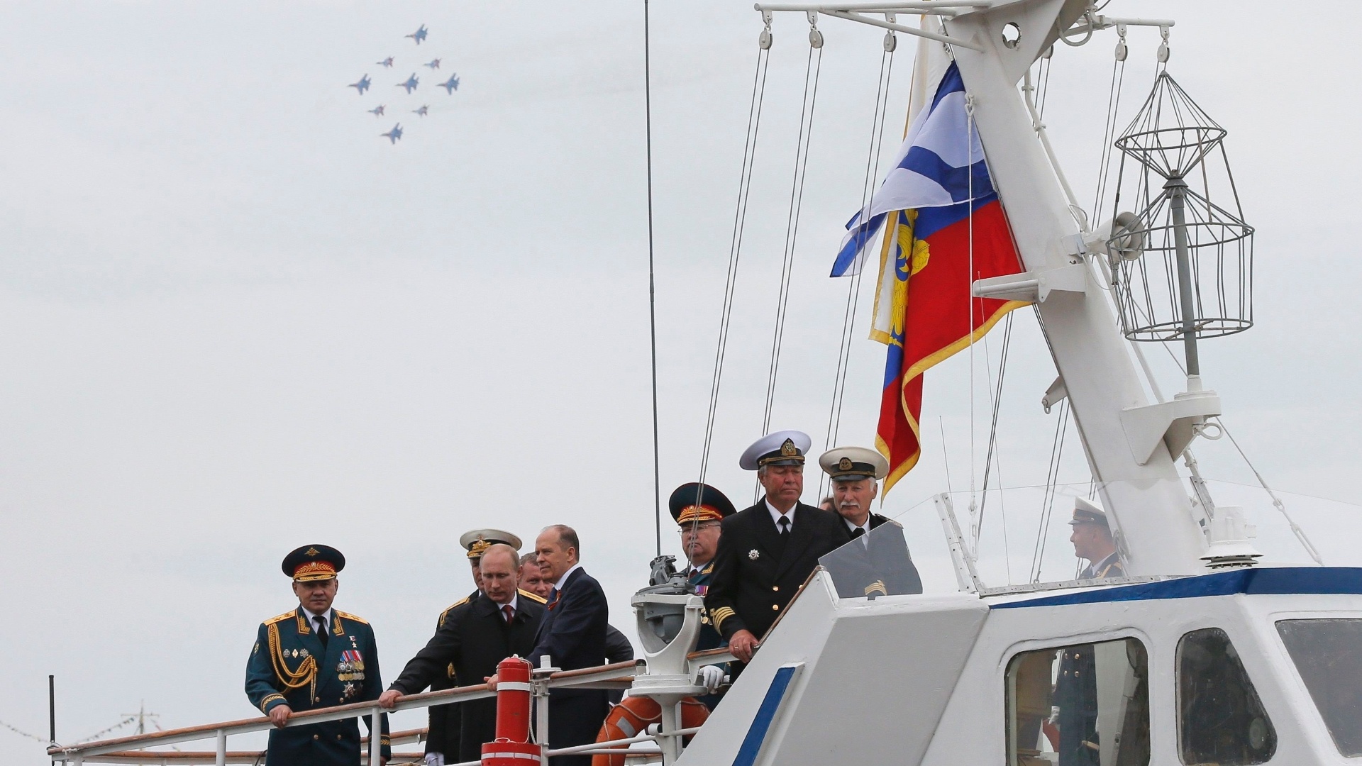 0:11 - Путин поднимается на палубу фрегата. 0:16 - На палубе принимает доклад экипажа. 0:19 - Реи крупным планом. 0:20 - 0:30 - прогуливается по палубе в сопровождении членов экипажа.