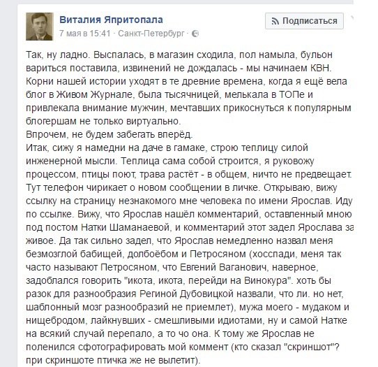 зашелестели клавиши, и пост правды для семи с половиной тысяч подписчиков полез из Виталии на свет. Поверьте, друзья, там гигантская простыня, я оставлю на неё ссылки