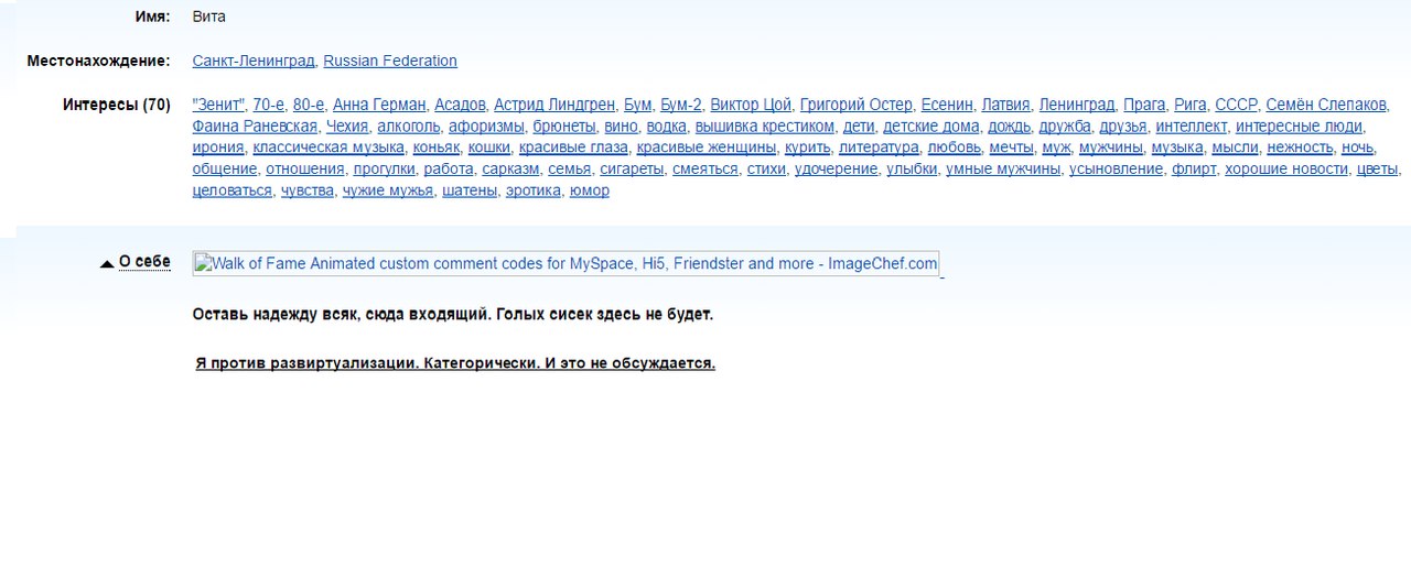 Но никому не удавалось заманить Виту на встречу, у всех этих мужчин - сексуальные проблемы, перверсии, поэтому, как выразилась роковая красотка - "ни с одним их этих мужчин я так и не встретилась в реале. Все они, вместе со своими "Англетерами", бриллиантами и деньгами были тактично (а иногда и не очень) посланы в жопу".
